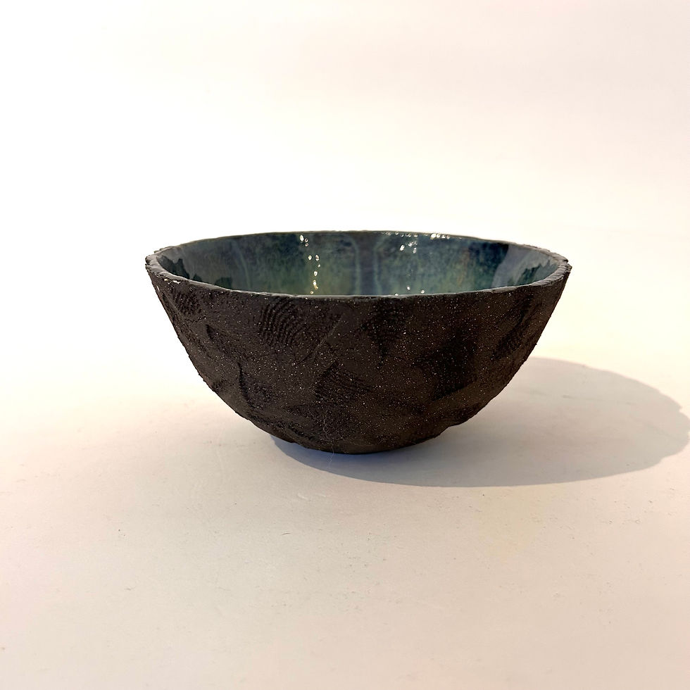 Liten keramikkskål med hjerteformet hull og grønn bunn